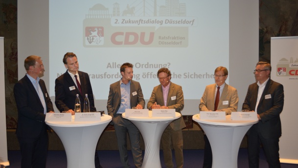 Über 100 Gäste erlebten diese Woche den zweiten Düsseldorfer „Zukunftsdialog“ der CDU-Ratsfraktion. Diesmal diskutierten unter der Leitung von Moderator Christian Zeelen Innen-Staatssekretär Dr. Günter Krings, Landtagsabgeordneter Peter Biesenbach, Polizeigewerkschaftler Oliver Huth, Jugendrichter Edwin Pütz und Ratsherr Andreas Hartnigk über das Thema Sicherheit. Einhelliger Tenor: Ein Mehr an Schutz scheitert häufig an den ideologischen Scheuklappen der Politik.