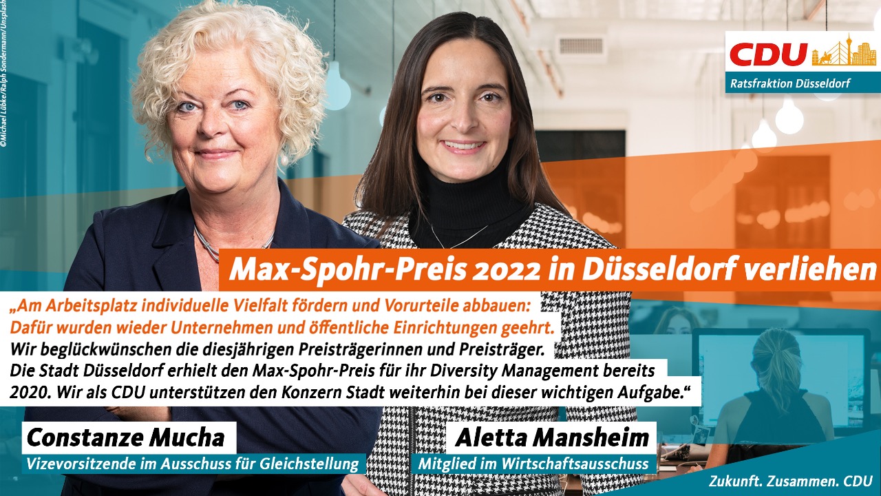 Die CDU-Fraktion setzt sich für Geschlechtergerechtigkeit, Gleichberechtigung und Vielfalt („Diversity“) in Wirtschaft, Stadtverwaltung und bei den städtischen Tochterfirmen ein. Wir freuen uns deshalb auch mit den diesjährigen Trägerinnen und Trägern des Max-Spohr-Preises für Diversity Management und gratulieren ihnen herzlich (Arvato Financial Solutions, Polizeiakademie Niedersachsen, Queere Haushaltshilfe Baumgärtel Berlin GmbH sowie Queere Nothilfe Ukraine). Die Preisverleihung fand kürzlich hier in Düsseldorf statt. Ausrichter waren die Stadt und die Robert Bosch GmbH. Beide sind Preisträger des Jahres 2020.