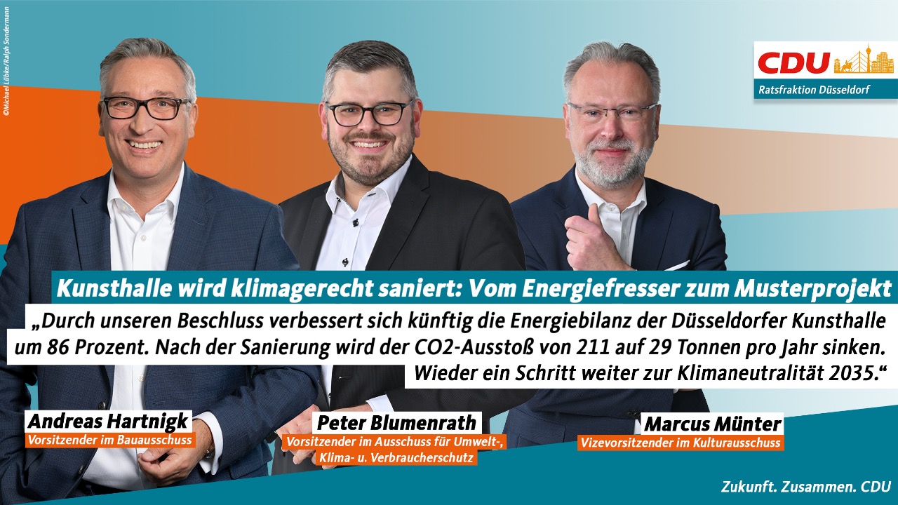 Die Düsseldorfer Kunsthalle bekommt dank der Initiative von CDU und GRÜNEN eine Rundum-Sanierung. Damit verbessern wir die Energiebilanz des Gebäudes entscheidend und fahren auch seinen Treibhausgas-Ausstoß (CO2) nachhaltig zurück. Insgesamt ist uns wichtig, dass städtische Gebäude deutlich schneller als bisher energetisch modernisiert werden. Das ist eine von mehreren wirksamen Maßnahmen, die wir politisch auf den Weg gebracht haben, um Düsseldorf bis 2035 klimaneutral zu machen. So steht's auch in unserem Haushaltsantrag aus 2021.